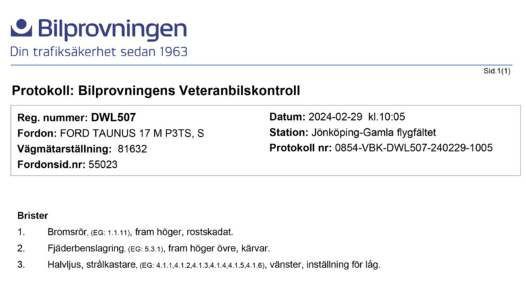 Besiktningsbefriad, men inte felfri. Bilprovningens Veteranbilskontroll skulle förstås gå som en dans, för Classic motor-redaktionen ”visste” ju att bilen var i bra skick. Men tji fick de, den gamla Taunusen hade fler fel än de trodde och det visade sig vara klokt att låta en oberoende part titta på skicket.