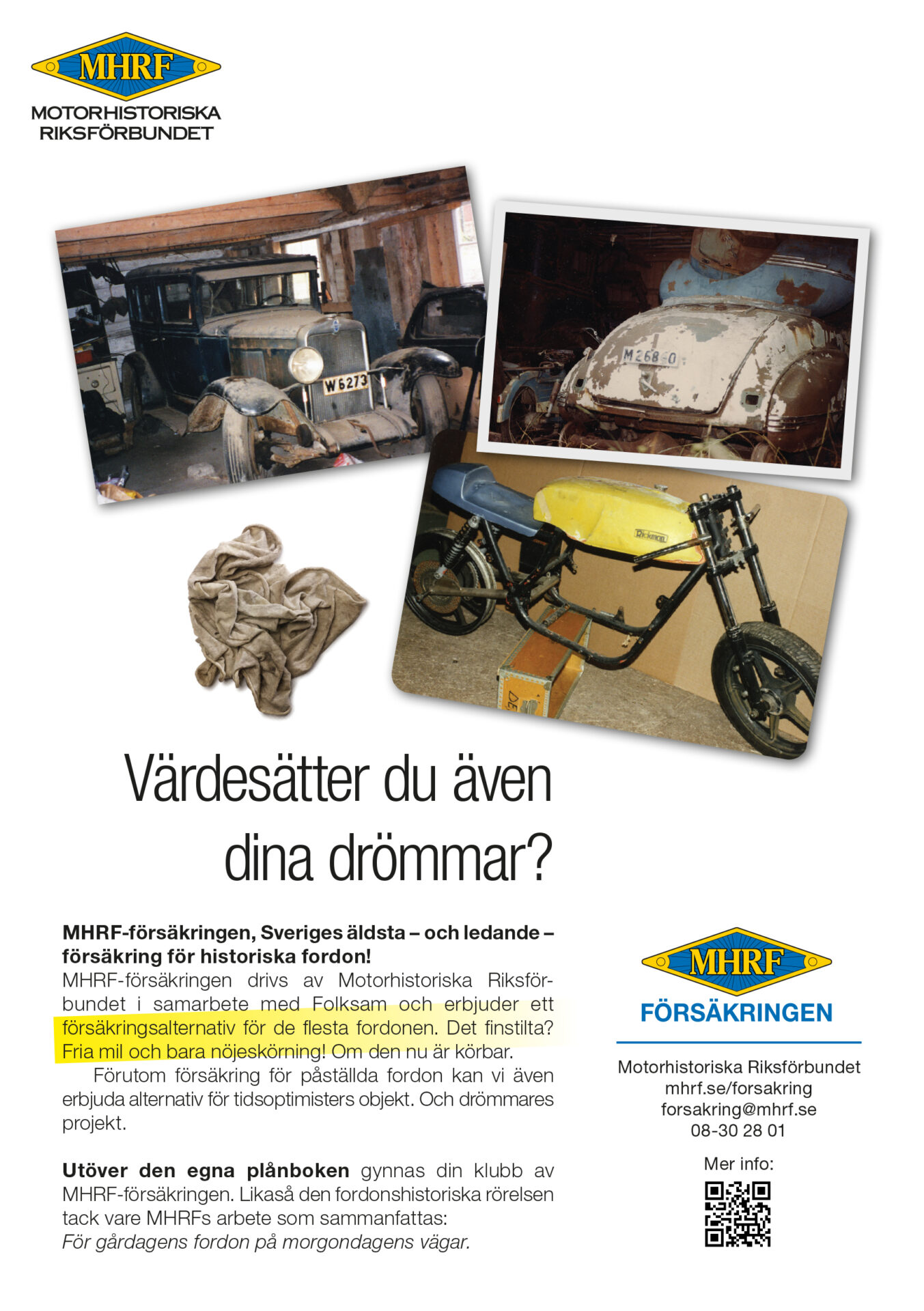 Motorhistoriska Riksförbundets informationsbroschyr med aktuella premier och nyheter från MHRF-försäkringen (som gäller från 1 maj 2025 till och med 30 april 2026!).