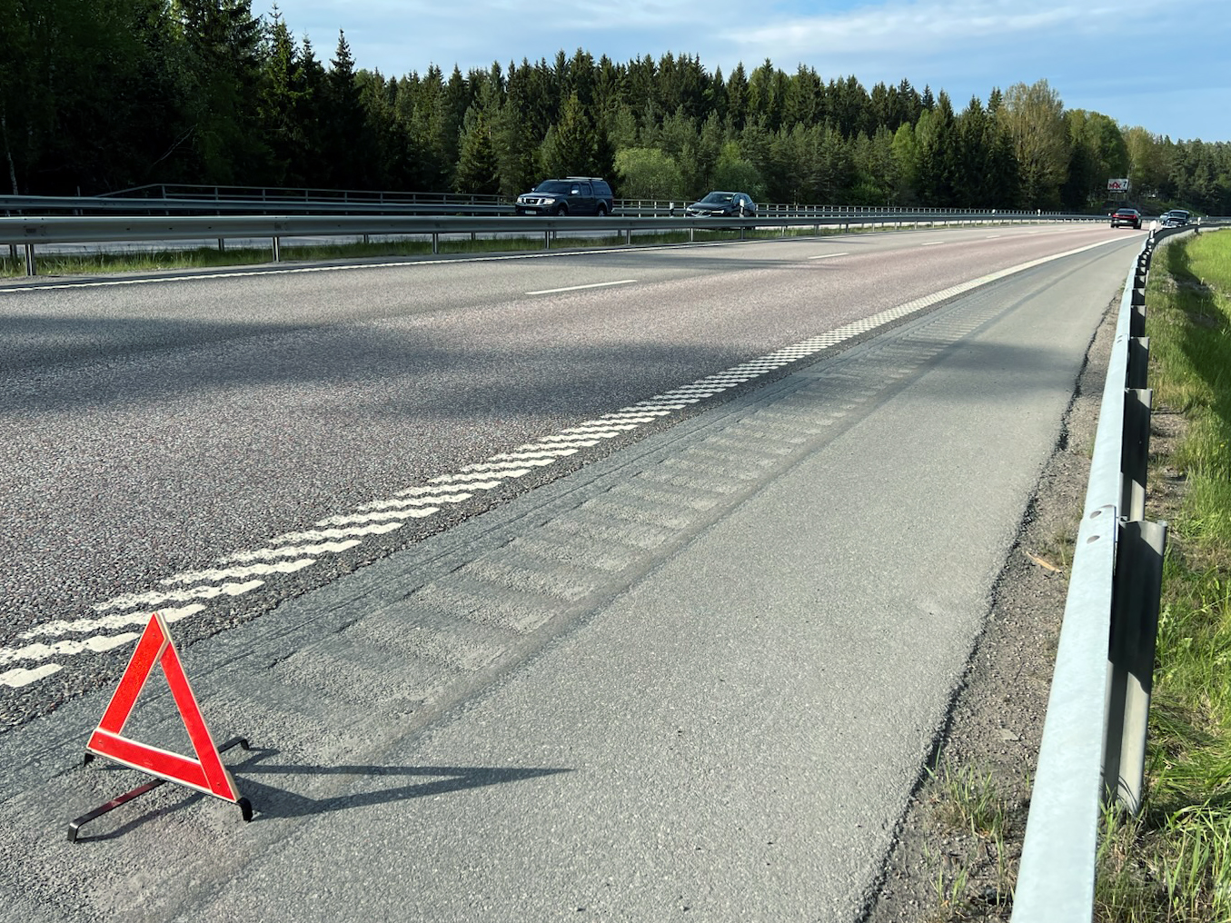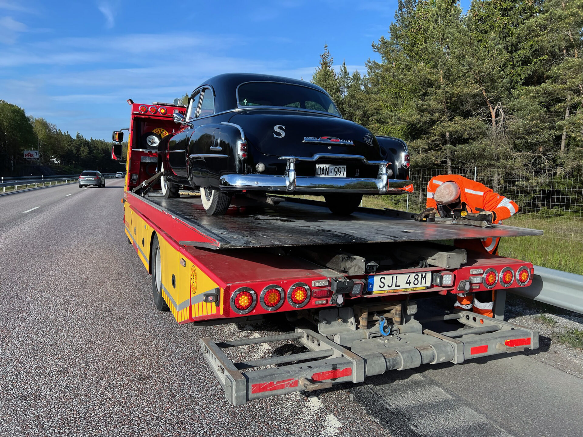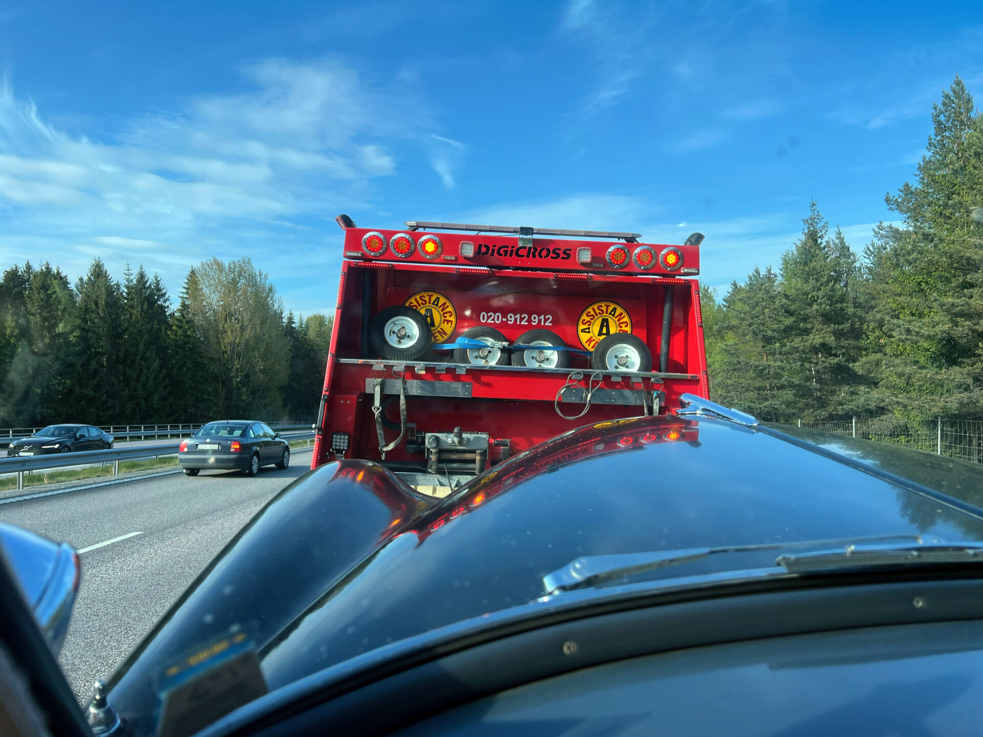 Efter att den gamla varningstriangeln plockats ur sitt originalfodral för första gången sedan 60-talet, och fick visa vad den gick för bland långtradare och husvagnar, var det läge att testa MHRF-försäkringen för första gången sedan den tecknades för närmare 30 år sedan. Efter tre klick via mhrf.se hittade jag rubriken Vid skada och rätt nummer (just detta är väldigt viktigt så att man inte ringer en bärgare på måfå visade sig en skräckhistoria från däcksparken i Tystberga!). Ett samtal med en hjälpsam handläggare på Folksam Jour som hade örnkoll på vad som gäller MHRF-försäkrade fordon, ett sms, några knapptryck senare, fick jag en länk för att beställa vägassistans som infann sig hyfsat snabbt, med tanke på rådande trafik och andra olycksdrabbade medtrafikanter, vid halv sex i form av en TMA-bil. Bil och förare bidrog till trevligt och tryggt sällskap, utöver avstånd till min bil och lite irritation bland förbipasserande som nu fick trängas i en istället för två filer. Medan vi väntade i solskenet kom nästa SMS-bekräftelse att bärgningsbil var på väg.